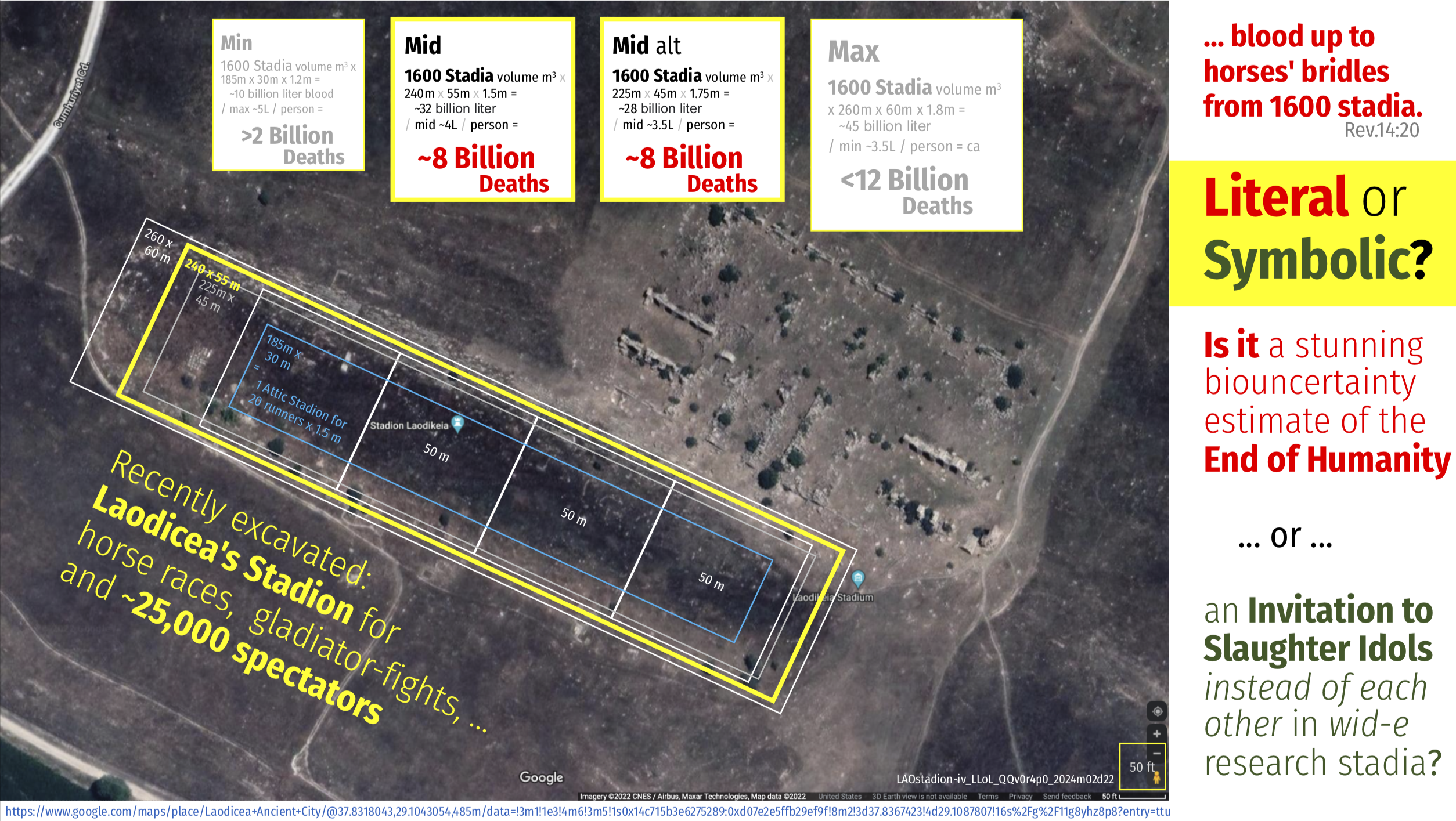 Google Earth snapshot of Ancient Laodicea with uncertainty estimates for the death toll implied by Rev. 14:20